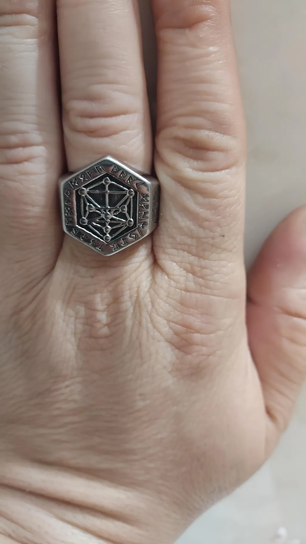 Singura problema a fost cu marimea, desi am luat masurile pentru a fi purtat pe degetul inelar, este prea mare pentru el, dar ulterior a fost mutat pe aratator unde sta perfect :)
